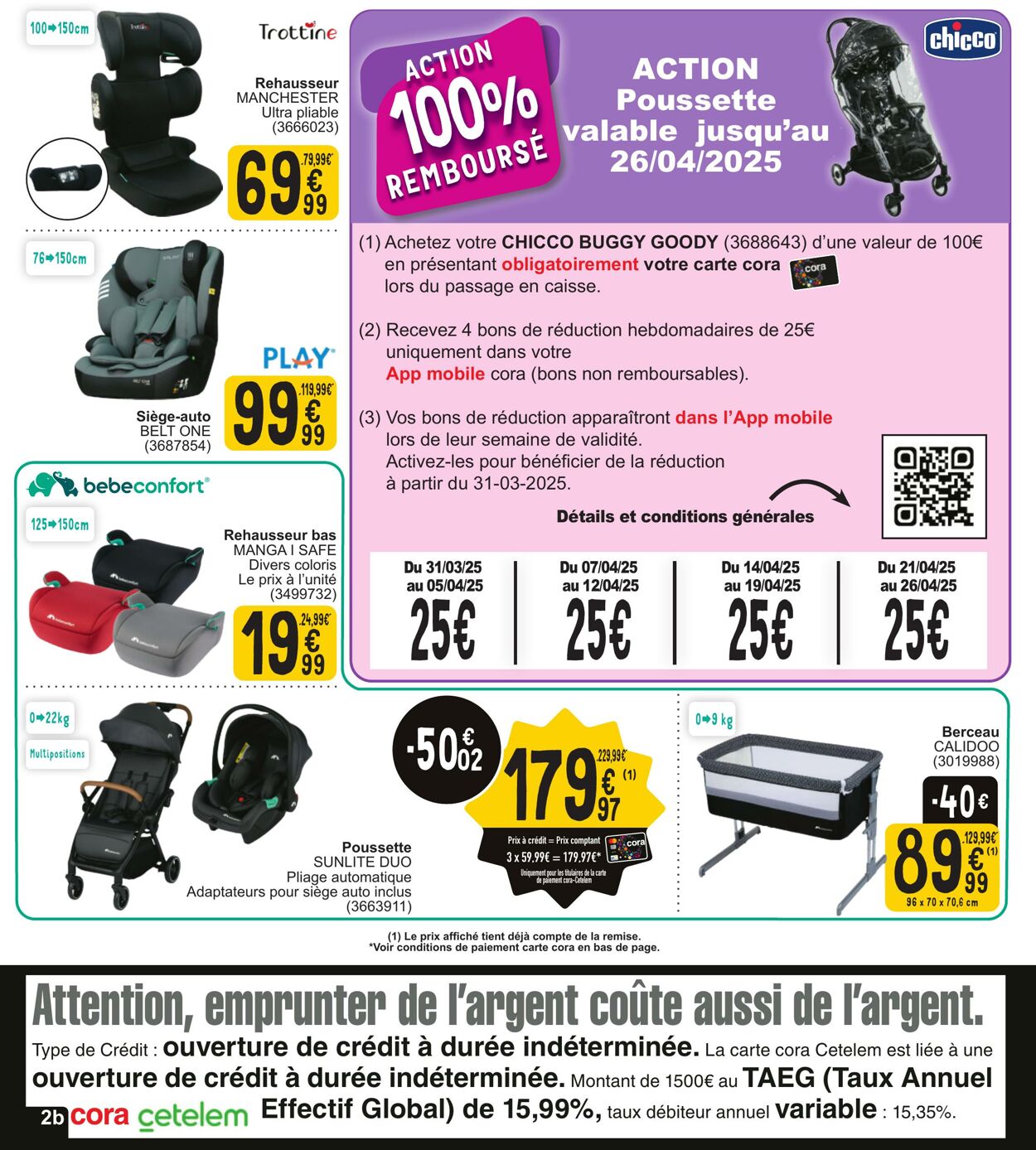 Trottine Rehausseur MANCHESTER Ultra pliable (3666023) (1) Achetez votre CHICCO BUGGY GOODY (3688643) d'une valeur de 100€ en présentant obligatoirement votre carte cora lors du passage en caisse. cm (2) Recevez 4 bons de réduction hebdomadaires de 25€ uniquement dans votre rai App mobile cora (bons non remboursables). Siège-auto CTE (3) Vos bons de réduction apparaîtront dans l’App mobile BELT ONE (3687854) lors de leur semaine de validité. Activez-les pour bénéficier de la réduction Q ©) 49%, bebeconfort à partir du 31-03-2025. ë 125% 150cm Détails et conditions générales © | Rehausseur bas MANGA | SAFE Divers coloris Du 31/03/25 Du 07/04/25 Du 14/04/25 Du 21/04/25 Le Pr éouran) au 05/04/25 au 12/04/25 au 19/04/25 au 26/04/25 HIHI 03 kg : Berceau CALIDOO (8019088) CAPES ep gere OCT ENT ES) i Pliage automatique Dogg 7 È ) Adaptateurs pour siège auto inclus ; LC (3663911) : (1) Le prix affiché tient déjà compte de la remise. “Voir conditions de paiement carte cora en bas de page. Attention, emprunter de l'argent coûte aussi de l'argent. Type de Créait : OUVerture de crédit à durée indéterminée. La carte cora Cetelem est liée à une ouverture de crédit à durée indéterminée. montant de 1500€ a TAEG (Taux Annuel cora cetelem Effectif Global) de 15,99%, taux débiteur annuel Variable : 15,35%4.