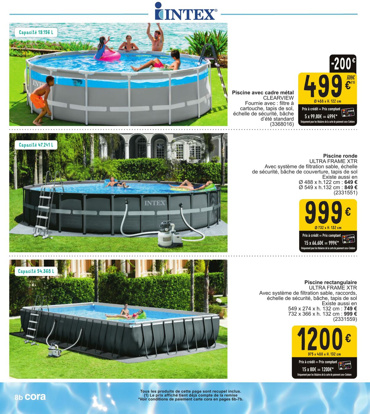 LINTEX Et €’ \ Piscine avec cadre métal \ CLEARVIEW Fournie avec : filtre à GARSRE EAN cartouche, tapis de sol, échelle de ares bâche standard (3368016) LUE ELLTE UE 5x 99.80€ = 499€ E COSTEPONENTENTEE Piscine ronde ULTRA FRAME XTR Avec système de filtration sable, échelle de sécurité, bâche de couverture, tapis de sol Pspxn 12e 310 999< 732 x H.132em CUT EL 15x66, Li [LL Piscine rectangulaire ULTRA FRAME XTR Avec système de filtration sable, raccords, échelle de sécurité, bâche, tapis de sol Existe aussi en 549 x 274 x h. 132 cm : 749 € 732 x 366 x h. 132 cm : 999 € (2331559) 1200: 975 x 468 x H. 132 cm LICE TE) 15x 80€ = 1200€* DER RES LASER EF re Tous les produits de cette page sont recupel inclus. {Le prixaffiohé tient déjà compte de la remise conditions de paiement carte cora en pages 6b-7b.