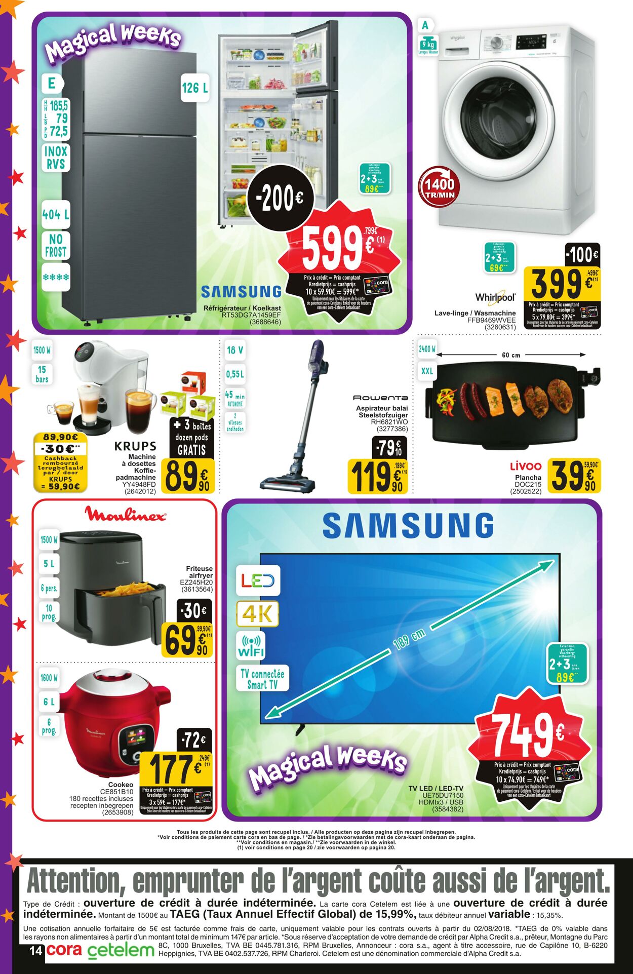 TR/MIN Whirlpool Lave-linge / Wasmachine FFB9469WVEE (8260631) Rowenrs Aspirateur balai elstofzuiger rss Ë Livoo padmachine Plancha YY4948FD DOC215 (2642012) : (2502522) Moulinex Friteuse airfryer EZ245H20 (8613564) o0ke0 ‘60 RES 180 recettes incluses [ans *# grepen 3908) A recupel incl. Al product op de pagina ain recupel inbegropen. talingsvoor#aarden met do cora-kaart onderaan de pagina. on magas mn ” {A} Voir conditions en page 20 /zie voorwaarden op pagina 20. Attention, emprunter de de Torvent coûte aussi de l'argent. Type de Crédit : Ouverture de crédit à durée indéterminée. La carte cora Cetelem est liée à une Ouverture de crédit à durée indéterminée. Montant de 1500€ a TAEG (Taux Annuel Effectif Global) de 15,99%, taux débiteur annuel Variable : 15,35%. Une cotisation annuelle forfaitaire de 5€ est facturée comme frais de carte, uniquement valable pour les contrats ouverts à partir du 02/08/2018. ‘TAEG de 0% valable dans les rayons non alimentaires à partir d'un montant total de minimum 147€ par article. “Sous réserve d'acceptation de votre demande de crédit par Alpha Credit s.a., prêteur, Montagne du Parc cora t | 8C, 1000 Bruxelles, TVA BE 0445.781.316, RPM Bruxelles, Annonceur : cora s.a., agent à titre accessoire, rue de Capilône 10, B-6220 14 CELEIEM Hcppignies, TVA BE 0402.537726, RPM Charleroi. Gotelem est une dénomination commerciale d'Alpha Credit s.a