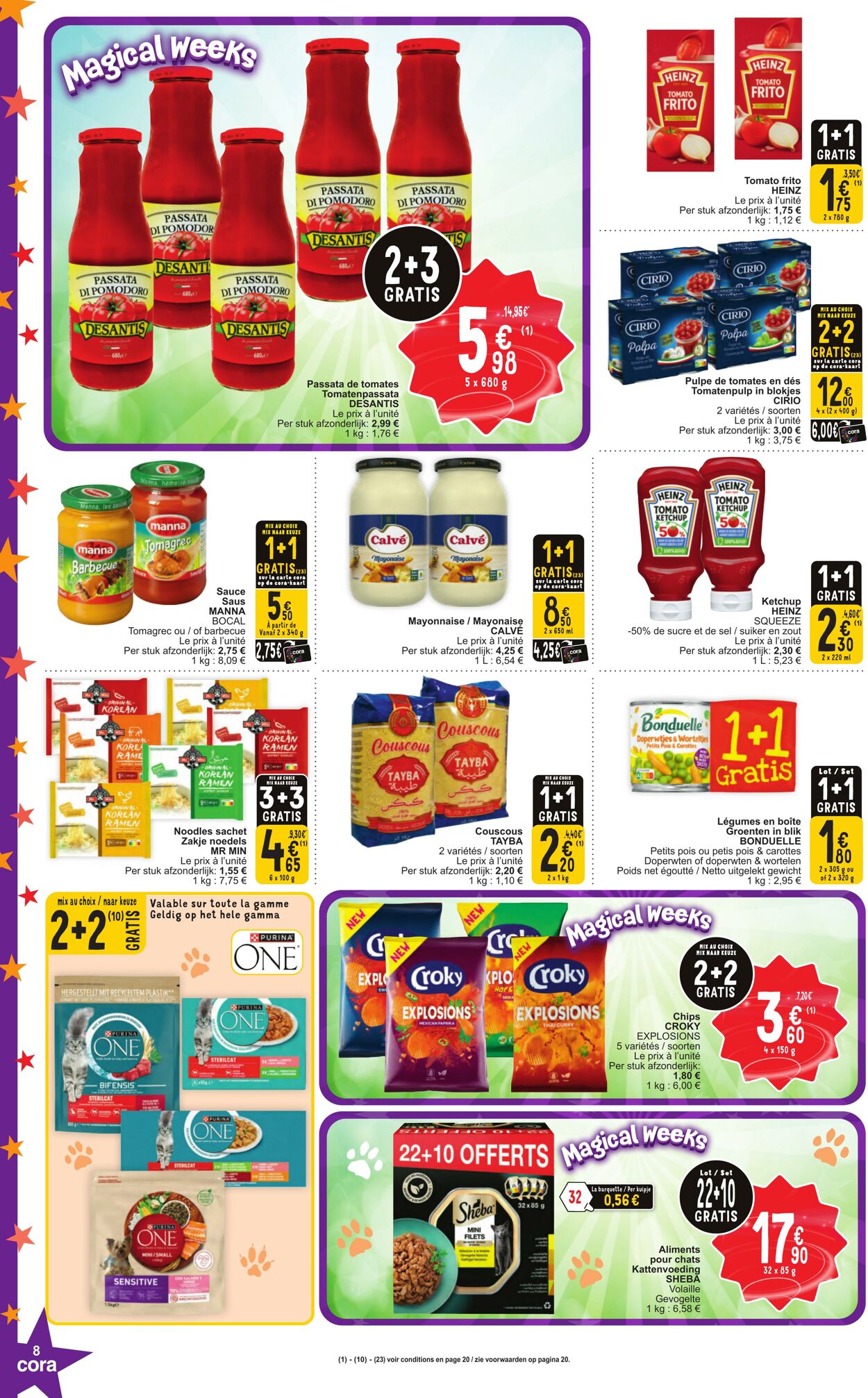 eee PASSATA pi POMODORI aus MANNA BOCAL Tomagrec ou / s patecue à l'unité Per stuk andere 275€ Le prix Srunté Per stuk ange 15€ 715€ mixauchoix/naarkeute | Valable sur toute La gamme (10)22" Geldig op het hele gamma = Æ = s E Lol} = | à dre Passata de tomates Per st tzonderik Noodles sachet Es. Zake nosdels MR Tome fo ge * M UDOR0 pc M ODOR ‘ £ rs PO] Le px Aa DLPOBREORO, DIPOREURO Per stuk one 175€ 2x780g : Pulpe de tomates en dés Di pasoatn Tomatenpulp in blokjes DESANTIS : 2 pe | soorten l'unité Le px à l'unité ,99 € AK: UE i Ketchup : HEINZ 4e Mayonnaise / Mayonaise UN : SQUEEZE à G) CALVÉ -50% de sucre et de sel / su en zout € à l'unité ix à l'unité Per stuk atorbie 425€ Per stuk atrondenie 230€ 23220 mi Légumes en boîte Couscous roenten in blik TAYBA DUELLE 2 variétés / soorten LP2tis pois ou pes pais & carotes Le prix à l'unité 20 penvien of doperwien & wortelen Parier 220 € Poids RE Égoutà ? Net gel goiont 1 10€ atig of2x AUS EXPLOSIONS 5 variétés / soorten prix à l'unité Per stuk afzonderljk: 1,80€ 1 kg : 6.00 À Aliments k as attenvoedins SHEBA {4) (10) (23) voi conditions en page 20/ze voorwaarden op pagina 20.