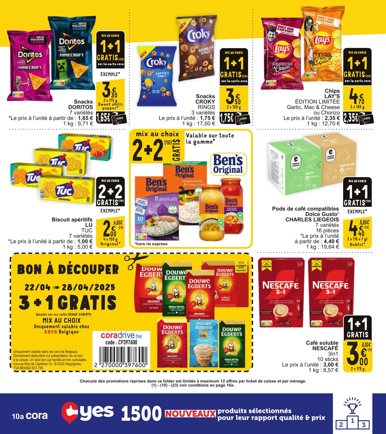IX AU exo 1+1 CET EXEMPLE* € à 30 | YS . Snacks M ,2st0e ROK ÉDITION LIMITÉE T0 DORITOS RINGS Garlic, Mac { & Cheese 2x185g 7 variétés 3 variétés u Chorizo *Le prix à l'unité à partir de : 1,65 € Le prix à l' une: 1,75€ Le prix à l unité: 2,35€ EE 1kg:9,71€ 1kg 117,50 € kg 12770 € mix AU.ChoixX Valable sur toute to la gamme* 2+2 = =; S Bens | Bens Original Original g 1 Bens = | OTE FF P una | Ju Pods de café sompadolss EXEMPLE* CHARLES LIEGEOIS A80€ 7 variétés (4) èces £ TUC 7 variétés *Le prix à l'unité 40 2x (6x 7g) *Le prix à l'unité à pari de L 90 € ns are ri express . à ie 20e É !l un: 1 i 1 : BON À DECOUPER ; i 1 1 22/04 w 28/04/2025 1 i 1 : 3 +1GRATIS i 1 i Valable su Les café DOUME EGERTS ï i MIX AU CHOIX A i Uniquement valable chez | gi : ! elgique radrive se | ME L 1 Café soluble i NESCAFÉ ame, ane va ns co Bus 1 en aa se Sin € la case Ursedont Fes dr nada 1 10 sticks TANGSNP 5 2.270000 397600 = en A ne 1 Lephal: se (RE Chacune des promotions reprises dans ce folder est à maximum 12 offres par ticket de caisse et par ménage. 3 200) 2 (23) voir conditions en page produits sélectionnés 10a COra # LS En 0 [NOUVEAUX] pour leur rapport qualité 8 prix